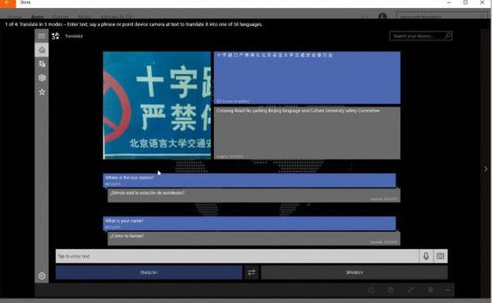 代号为“翻译10 Beta”的应用程序提供了易于使用的文本翻译,支持50种不同的语言,而且支持摄像头翻译,据微软表示,这种功能可以让用户将摄像头对准招牌,菜单,报纸或任何印刷文本,应用程序即可提供19种语言的翻译结果。同时,应用程序还带有文本到语音转换功能,支持10种语言。应用程序还支持脱机翻译,用户可以下载翻译包离线使用。
