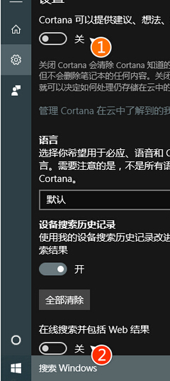 3、进入后,先关闭Cortana功能,再关闭下方Web搜索功能