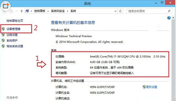 2、在这台电脑属性中,我们已经可以直观的查看到CPU(处理器)、内存等部分核心硬件信息。另外我们还需要查看显卡,因此还需要点击左侧的【设备管理器】,进入Win10任务管理器,如下图所示: