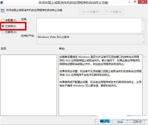 4、双击右侧窗口中的关闭会阻止或取消关机的应用程序的自动终止功能,在弹出的新对话框中奖配置修改已启用然后确定保存即可。