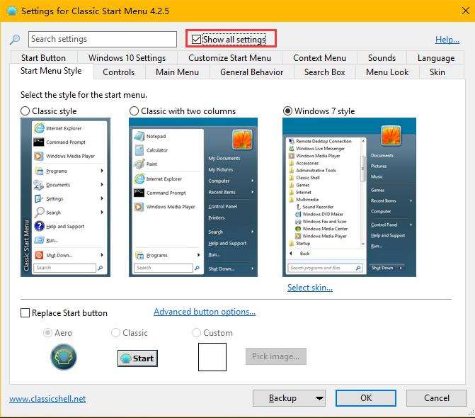 打开classic shell之后,选择show all setting获取更多设置选项,如图所示: