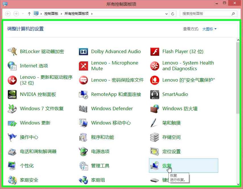 2. 在控制面板中找到恢复选项,点击进去:如图